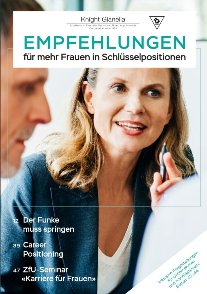 Das Executive Search Beratungsunternehmen Knight Gianella konzentriert sich auf die nationale und internationale Suche sowie auf die Evaluation von Führungskräften auf Stufe Geschäftsleitung, CEO und Verwaltungsrat. Der Leistungsausweis bezüglich der weiblichen Besetzungen ist bedeutend und nachhaltig. Knight Gianella ist Herausgeber der jährlich durchgeführten Knight Gianella Verwaltungsrats-Umfrage.